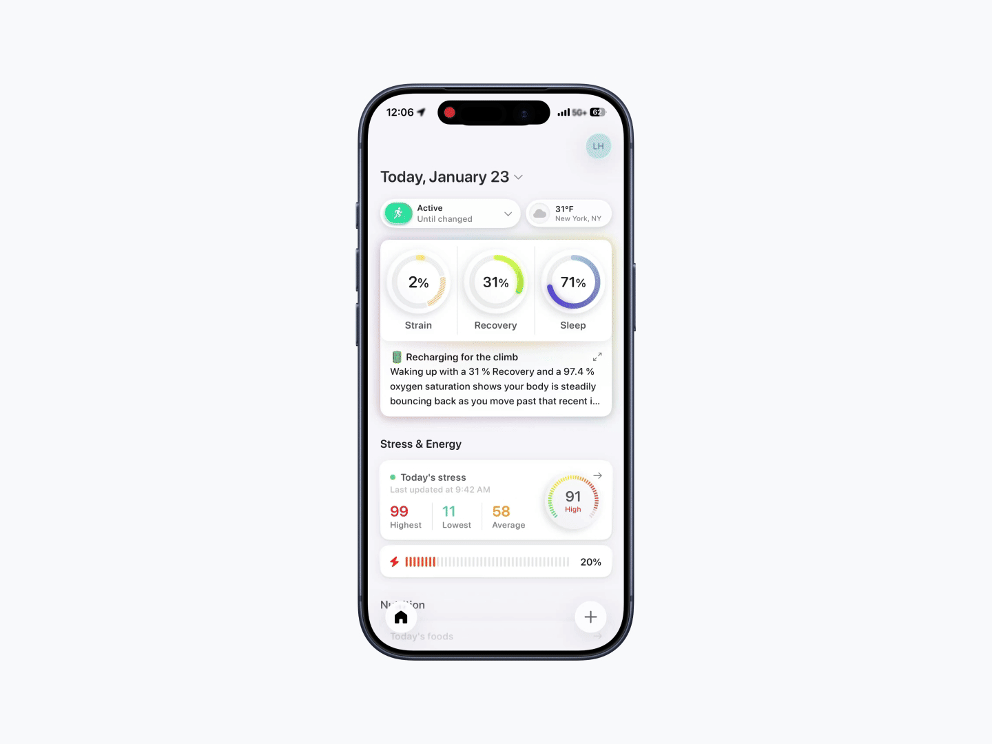 Examples include Strain, Recovery, Sleep, Stress, and Nutrition, as well as other health monitoring areas.