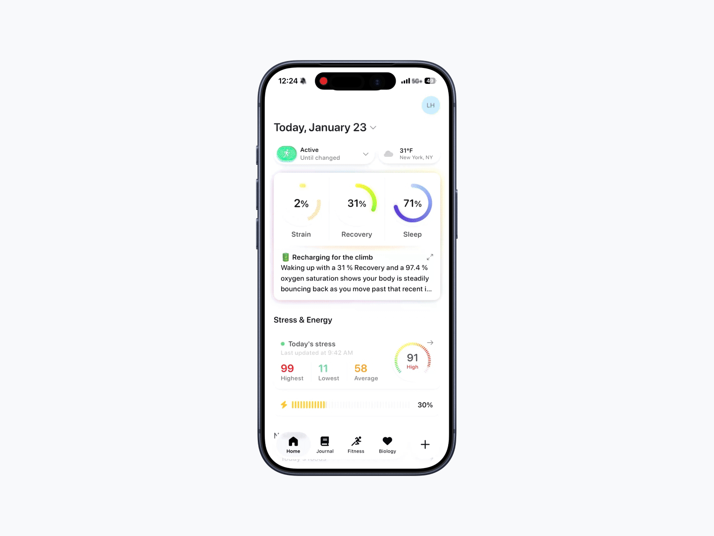 This view is available across areas like Strain, Recovery, Sleep, Stress, Energy Bank, and Nutrition.