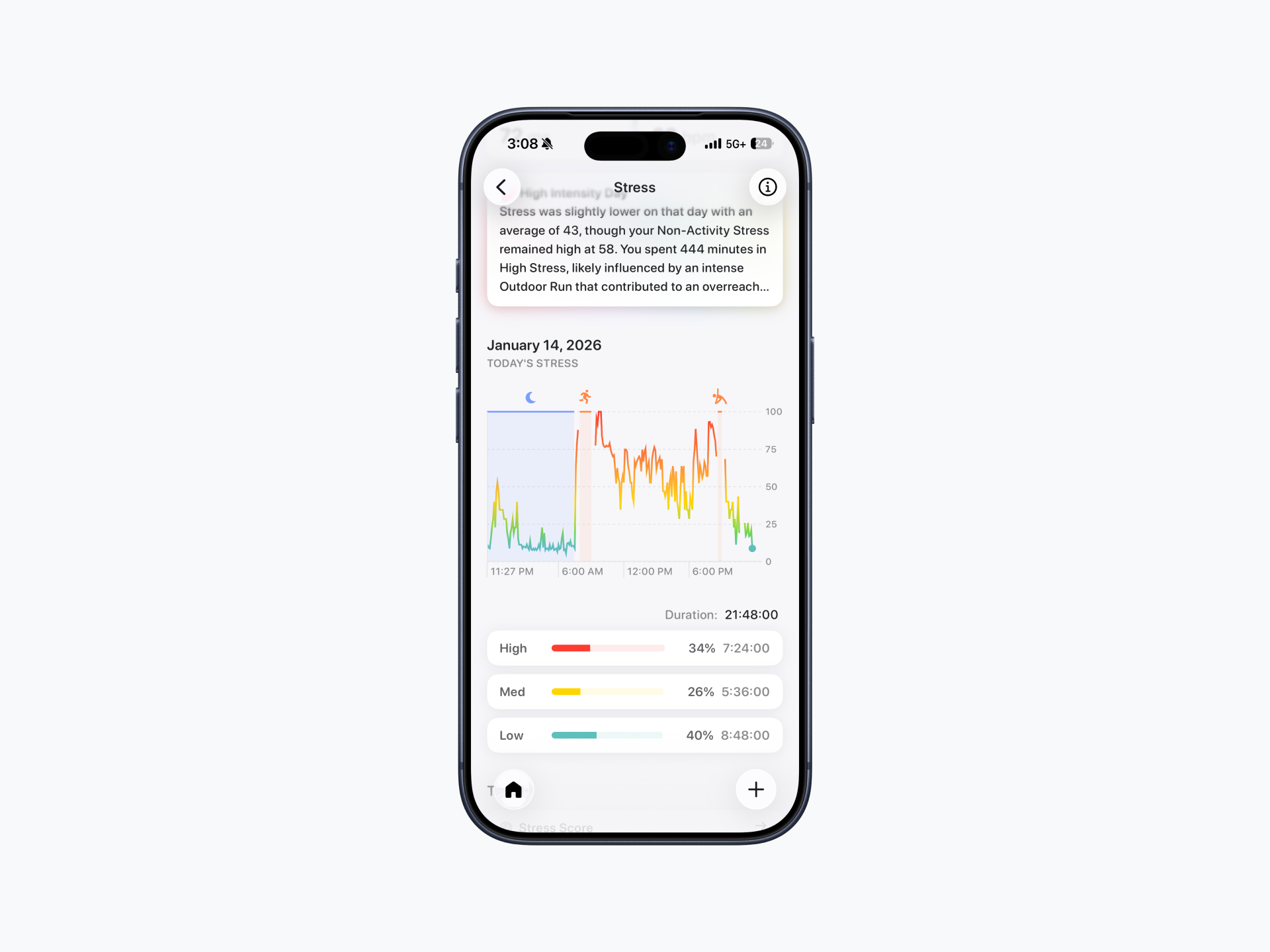 Even though Stress isn’t displayed during exercise (as shown in the shaded portion below), Active Stress is still tracked in the background and continues to contribute to your Energy Bank. This ensures that your overall Recovery and Energy Bank insights remain accurate. Stress tracking automatically resumes once your workout is complete, maintaining reliable insights without confusion.