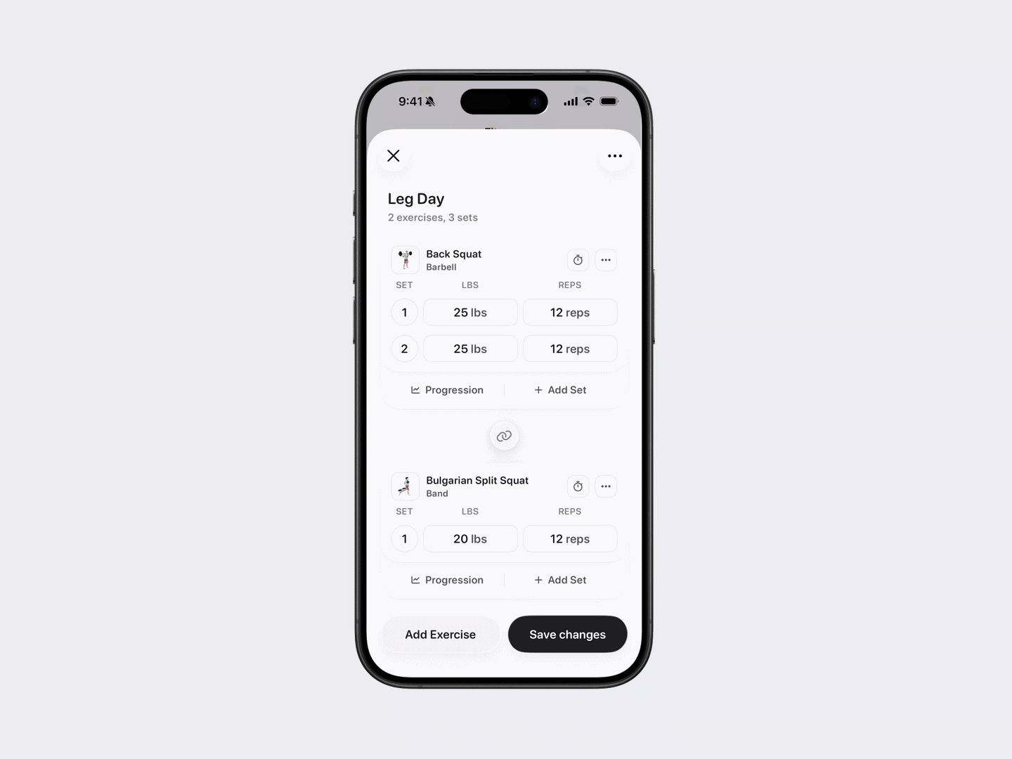 Add exercises: Tap Add Exercise at the bottom-left.